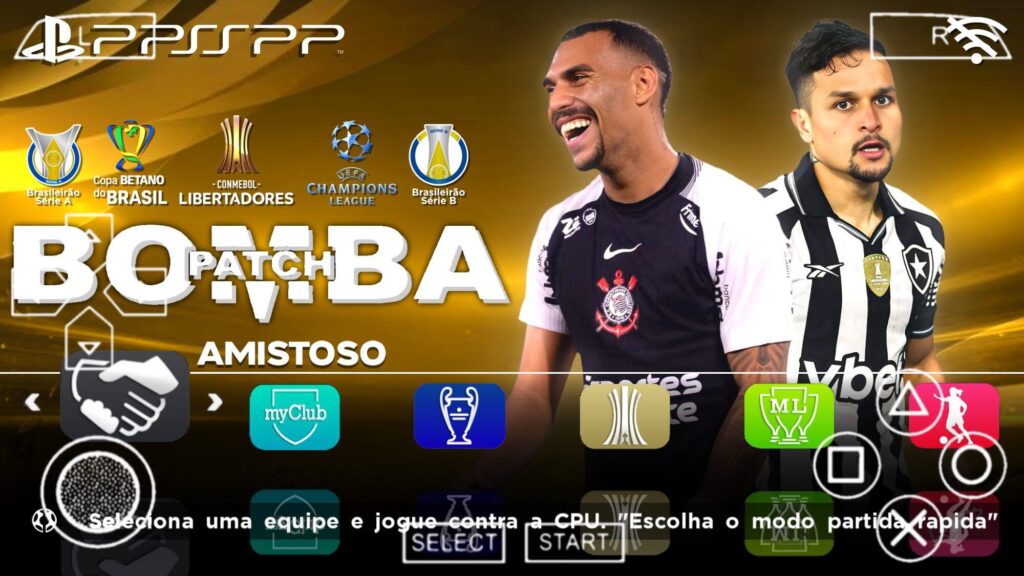 No Bomba Patch 2026 PPSSPP você pode aprender jogando primeiramente o modo amistoso, nesse modo você pode mudar a condição fisica dos jogadores, o tempo da partida, a dificuldade para que você aprenda mais rápido, e os estádios junto com o clima da partida, fora isso, você pode decidir se o jogo vai ter cena de entrada, ou se pula direto para a partida. Caso não goste, você pode tirar as prorrogações, fazendo isso, caso empate, vai direto para disputa de pênaltis. Os melhores modos de jogo estão inclusos no Bomba Patch 2026 PPSSPP, Master League e Rumo ao Estrelato, podendo fazer história com um time, ou com apenas um jogador. Você pode jogar as principais ligas do futebol mundial sem precisar da Master League e Rumo ao Estrelato, no Bomba Patch 2026 PPSSPP, você tem a opção de jogar ligas e copas separadamente. E por fim o modo treinamento, para que você aprenda a jogar da forma correta e ser tornar um jogador exepcional.
