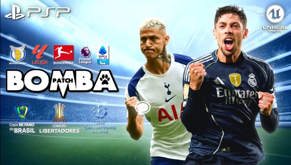 O Bomba Patch 2026 PPSSPP foi remasterizado, quem conhece sabe que os jogos de futebol por padrão vem com os gramados meio esbranquiçado, com as modificações nos estádios, conseguimos deixar os gramados mais verdes e saturados, fora isso as imagens do jogo estão em full HD, e nos estádios contém placas de publicidade da liga que você está jogando, igual nos consoles. A jogabilidade não mudou muito, é basicamente a padrão do jogo, ainda não conseguimos fazer muita coisa, mas basicamente, você pode fazer gol de todos os tipos, pode fazer várias jogadas, como por exemplo o (toca e passa), basta tocar segurando o R+X, o jogador passa na frente e você aperta o “TRIANGULO”, pronto a jogada está completa.